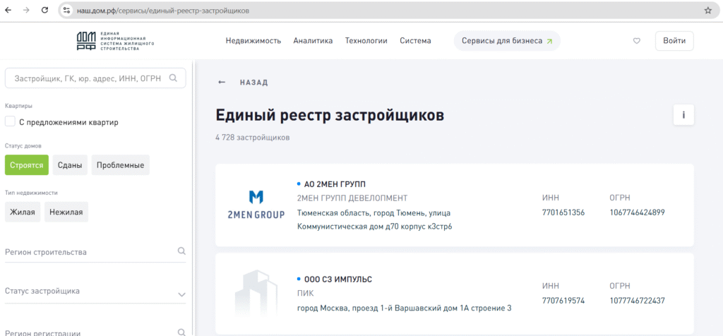 Единый реестр застройщиков.